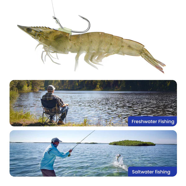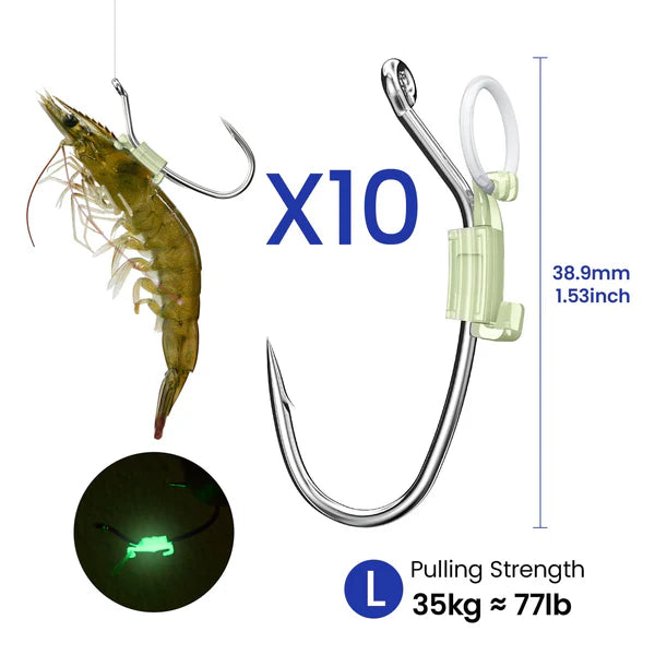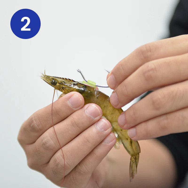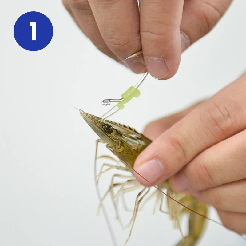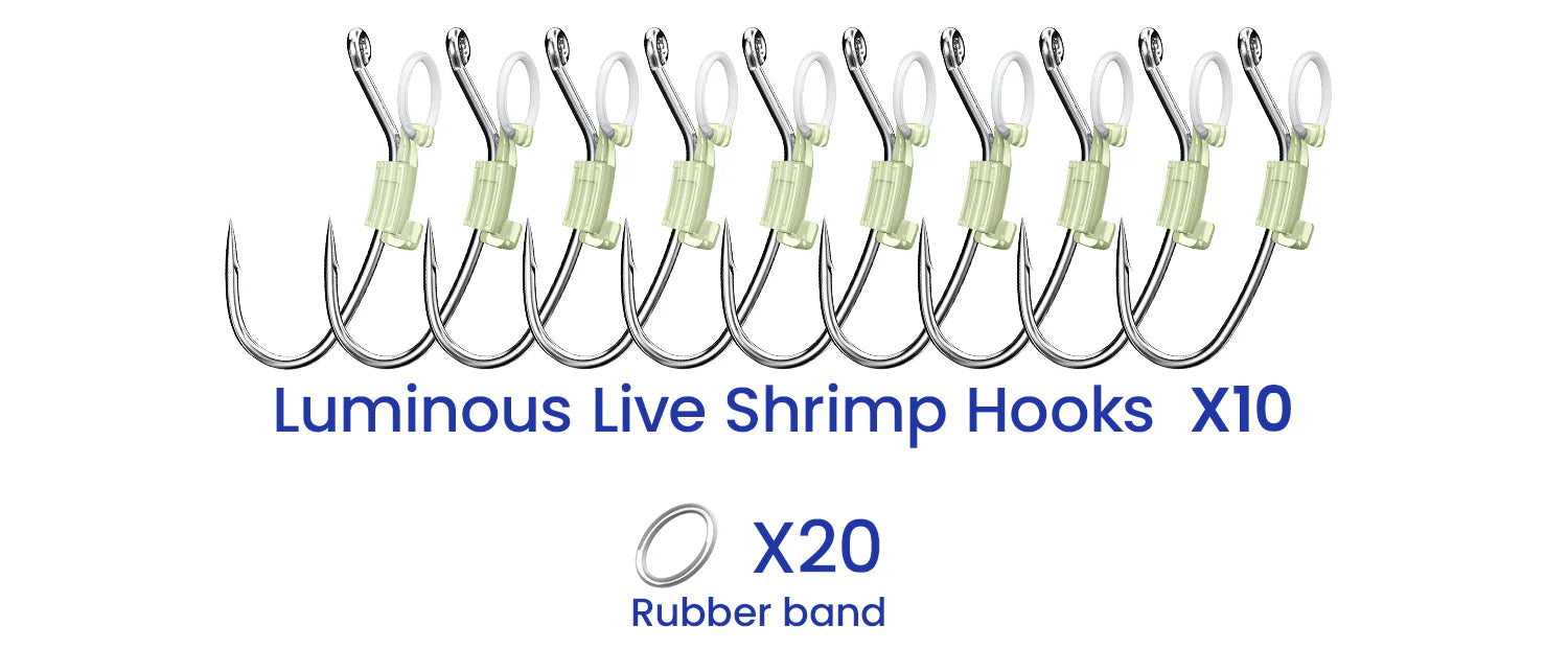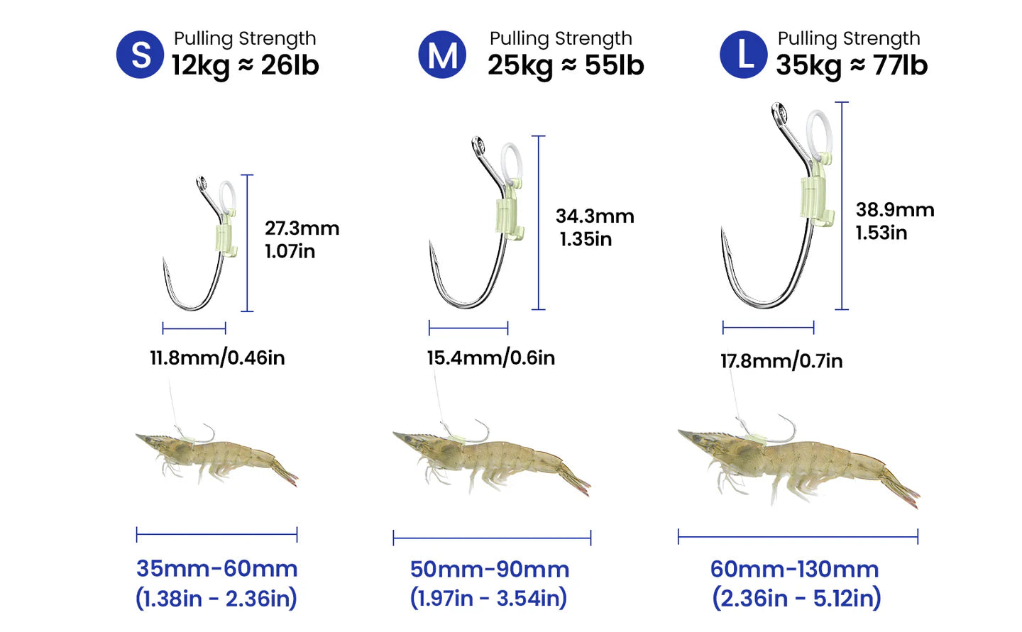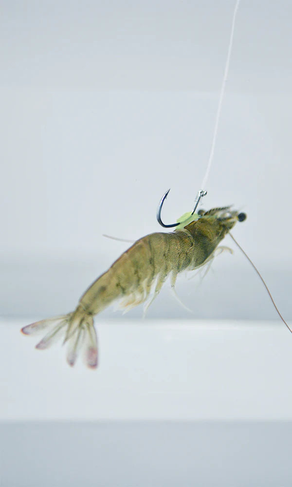 The hook is cleverly designed to attach securely to shrimp shells without piercing or harming them, ensuring they stay at maximum vitality in the water for longer, making them more appealing to larger fish.
