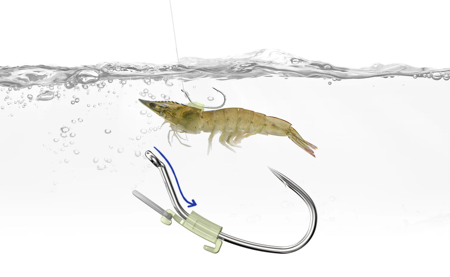 The curved hook shank design allows live shrimp to stay balanced underwater, enabling them to swim more naturally.