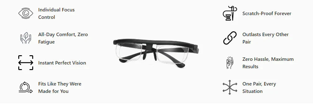 Revolutionary dual-adjustment technology means your weaker eye gets stronger correction while your good eye stays comfortable. Most people have different vision in each eye - It is the first glasses designed for this reality.