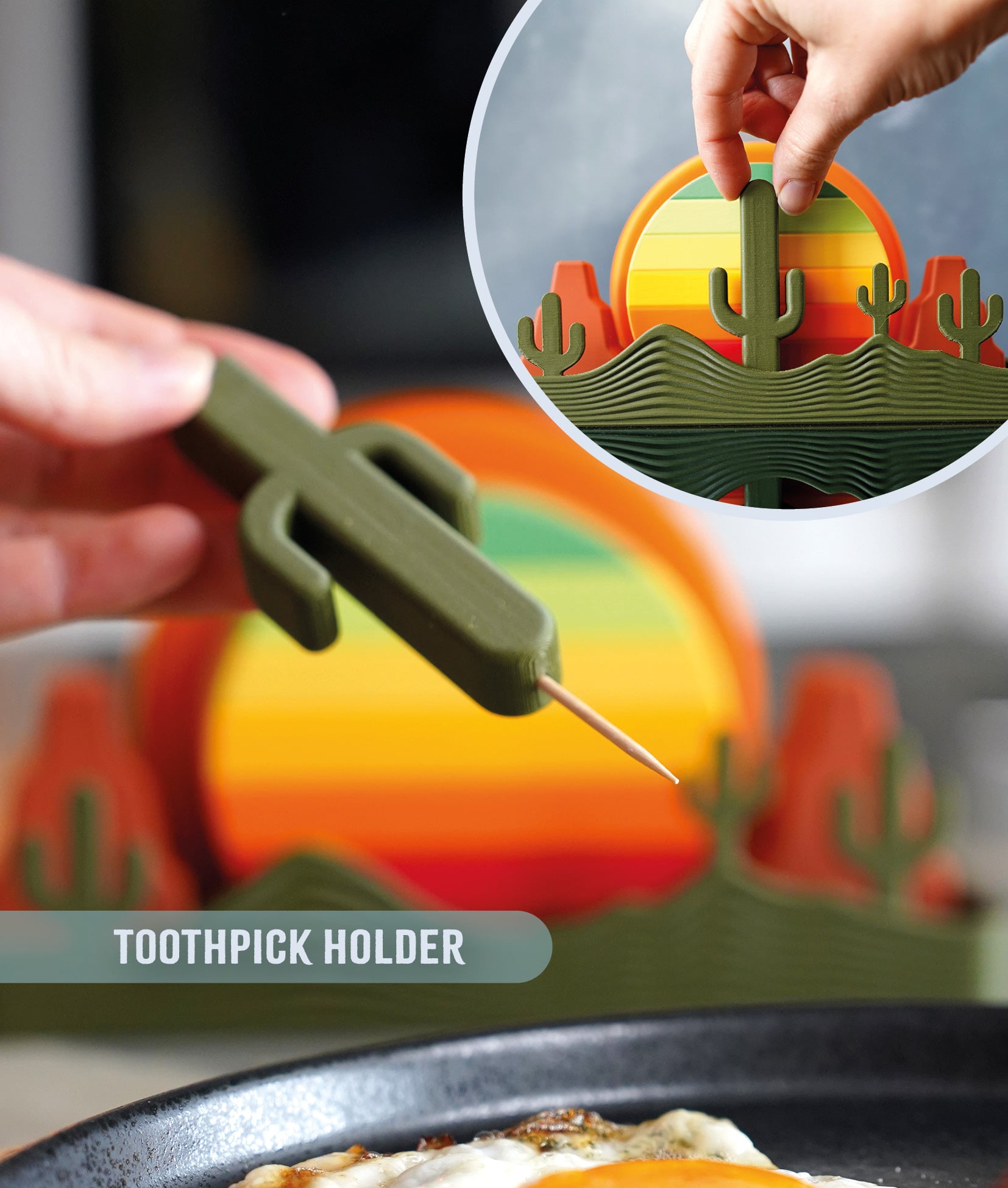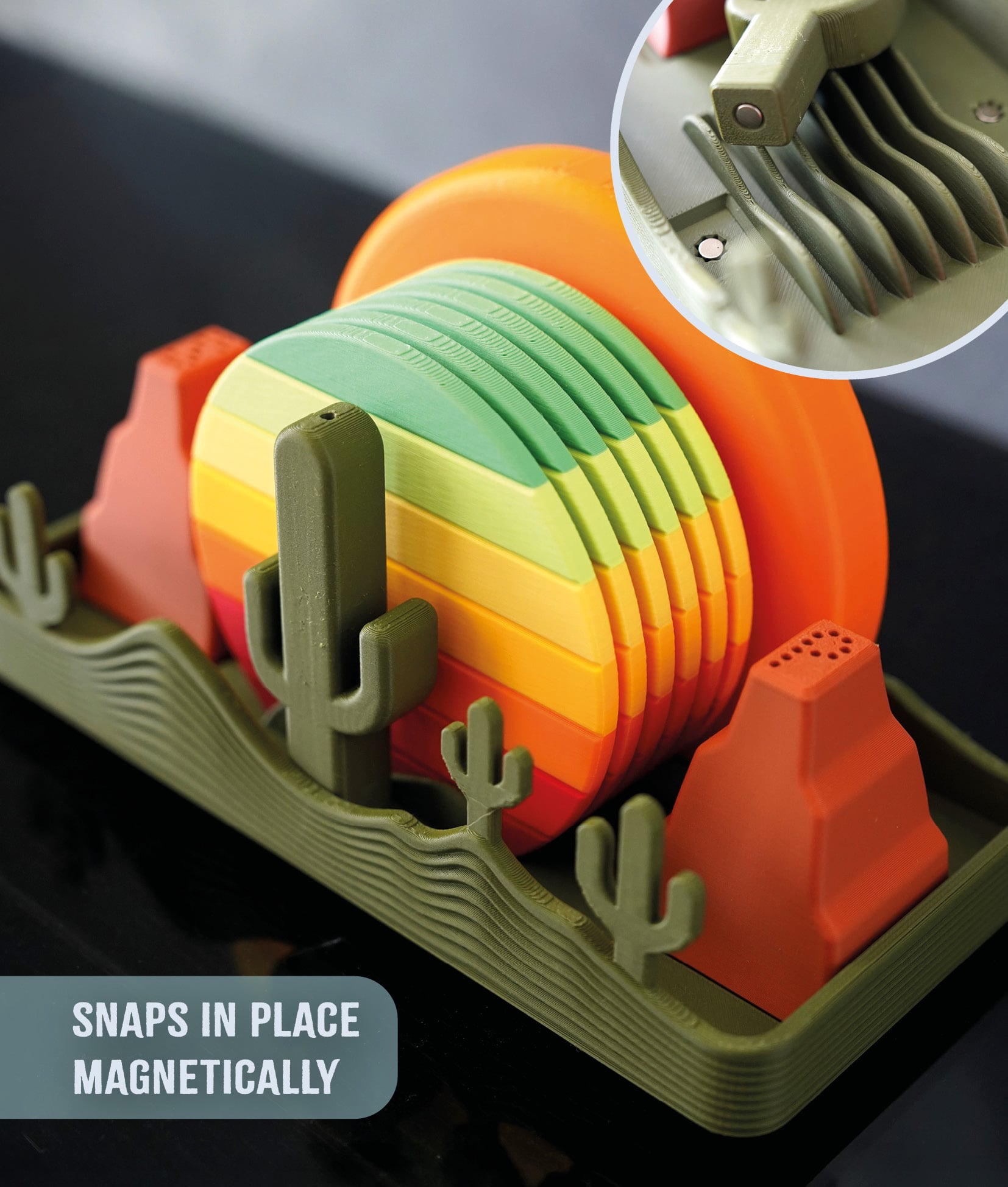 Bringen Sie mit diesem Sonnenuntergangs-Untersetzer-Set die goldene Stunde an Ihren Tisch! Dieses lustige, von der Wüste inspirierte Set eignet sich perfekt für Sommergrillabende, Cocktailpartys oder als Geschenk, um ein Gespräch anzuregen.