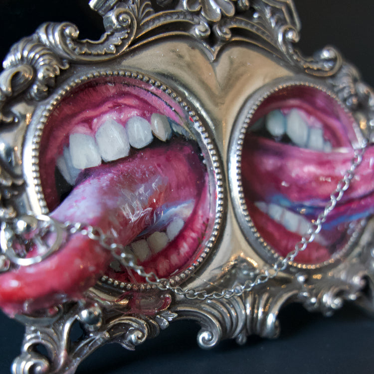 Luxuriöse Rahmung: Jedes Stück ist in einen wunderschön detaillierten, Vintage-inspirierten Rahmen eingefasst, der mit eleganten Akzenten verziert ist und rebellische Kunst mit zeitloser Eleganz verbindet.