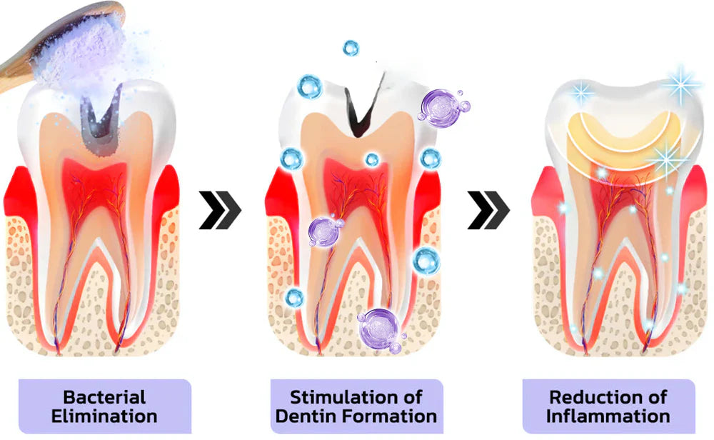 Beseitigt 99,99 % der Bakterien, beseitigt Mundgeruch, entfernt Plaque und Zahnstein, behandelt Gingivitis und Parodontitis, lindert Zahnschmerzen, beugt Karies vor und behandelt sie, stellt den Zahnschmelz wieder her, stimuliert die reparative Dentinbildung und unterstützt die Regeneration verlorener Zähne.