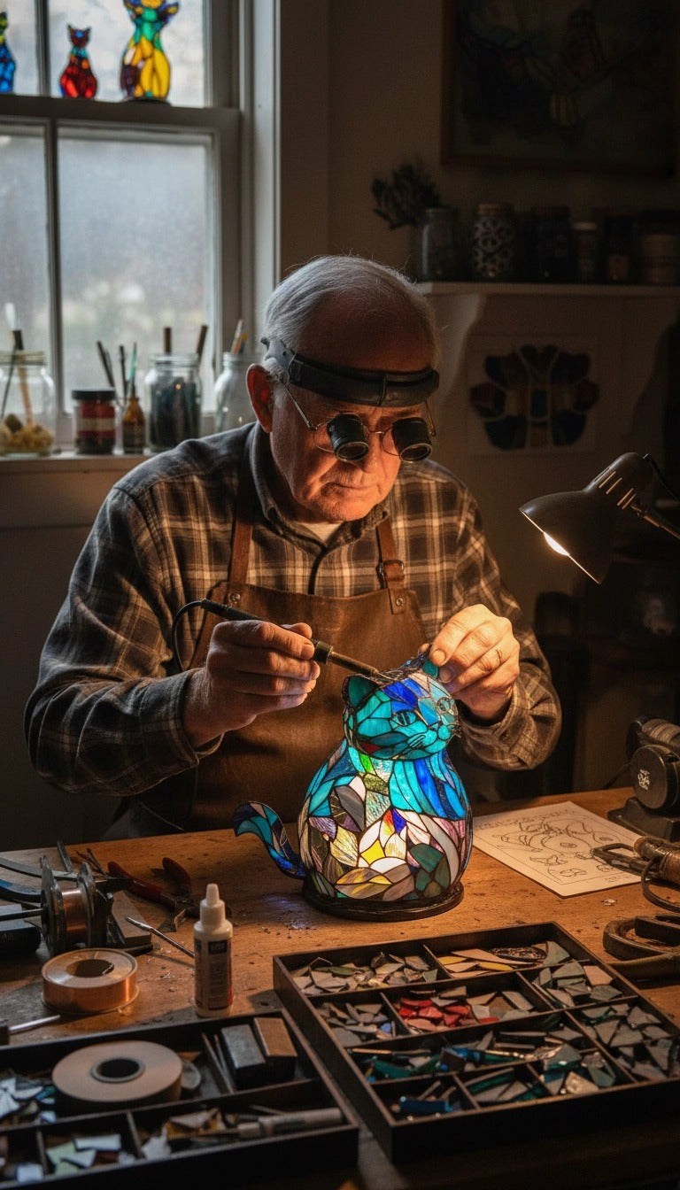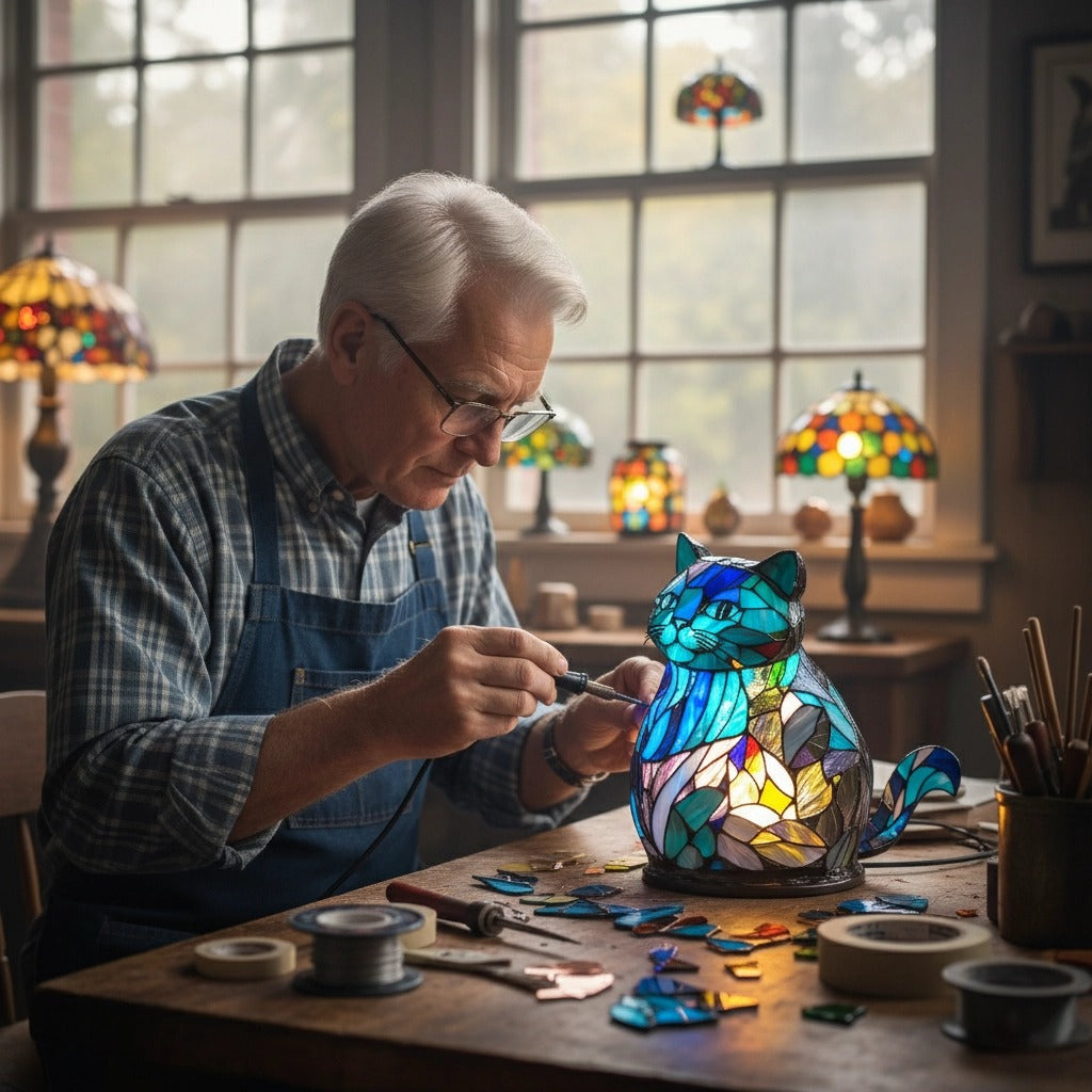 This handcrafted vintage stained glass table lamp features exquisite stained glass pieces arranged in a decorative pattern. The pieces are welded together with copper foil to form a vintage lampshade. While the "vintage style" is most commonly used in the shades of vintage table lamps or floor lamps, it can also be applied to other lighting fixtures. I've incorporated this technique into my animal-themed table lamps, and the entire process, from a drawing to a lamp that warms a space, embodies my dedication, patience, and pursuit of beauty. This handcrafted vintage stained glass table lamp not only illuminates your room but also tells a story about creation, craftsmanship, and timeless beauty.