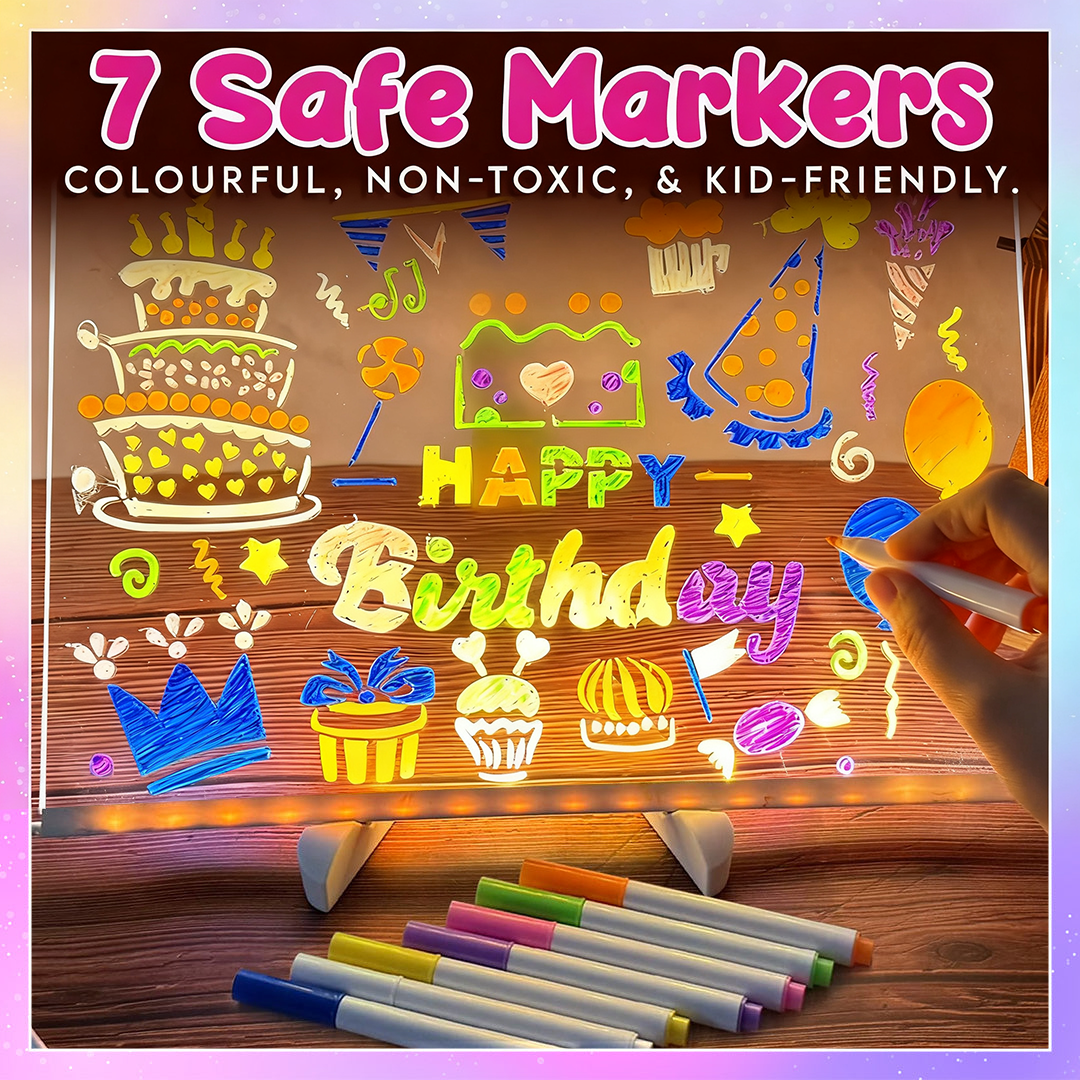 The set comes complete with a vibrant LED drawing board measuring 20cm × 30cm, a sturdy stand, and a set of 7 bright, colorful markers.
