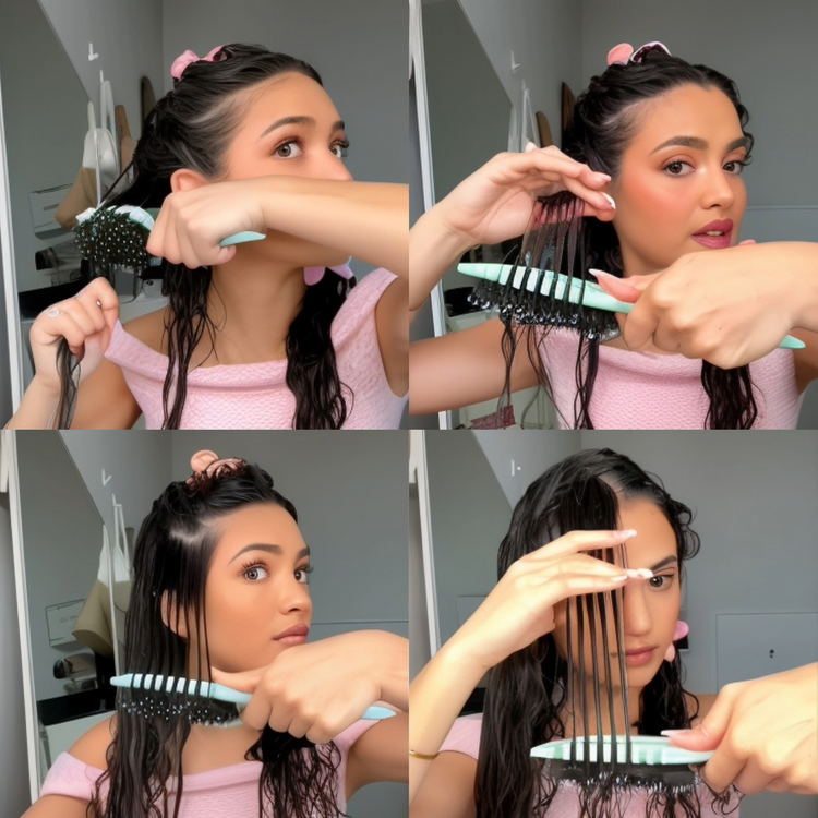 Start with damp curls and your favorite product. Brush downward slowly, and you’ll see your curls instantly pop into smooth, shiny clumps.It's effortless—and oddly satisfying.