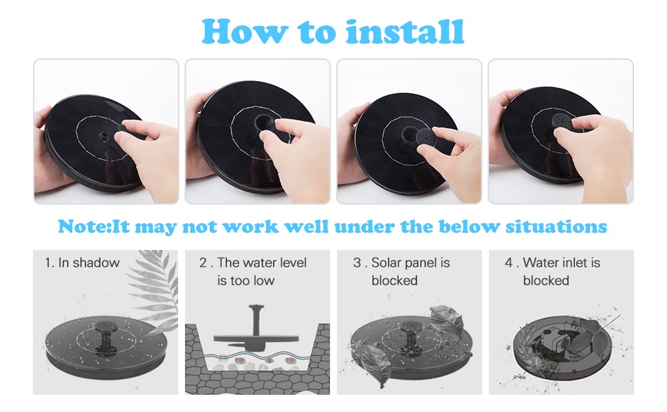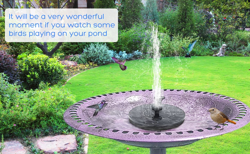 Simply place the fountain in water, and it will start working instantly under sunlight. Perfect for birdbaths, small ponds, fish tanks, or garden decoration. Regular cleaning and water changes will keep it running smoothly for years.