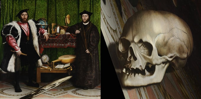One of the most iconic examples of anamorphosis comes from Hans Holbein the Younger's 1533 painting The Ambassadors . Across the bottom of the canvas, there's a grey smear — meaningless at first glance. But from an oblique angle near the edge of the room, that smear becomes a perfect skull. It's a hidden memento mori , a reminder that whatever power or knowledge The Ambassadors may hold, it all fades in time. Death winks at you from the corner. Bam!