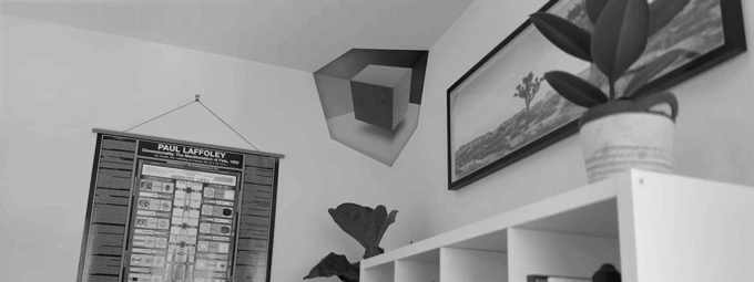 This works because of the mathematics of perspective — when the decals generate the same visual input as if a floating object were present, the mind has no reason to reject that interpretation. Surprisingly, the illusion remains convincing even as you move —reinforcing its legitimacy and causing the brain to lock even more deeply into the perception of a rotating object suspended in the corner.