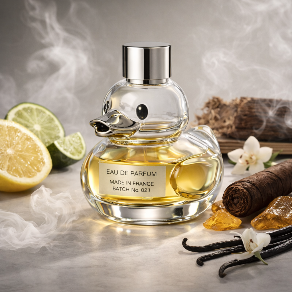 With its sculptural duck silhouette and clear glass finish, this perfume bottle is designed to be displayed.