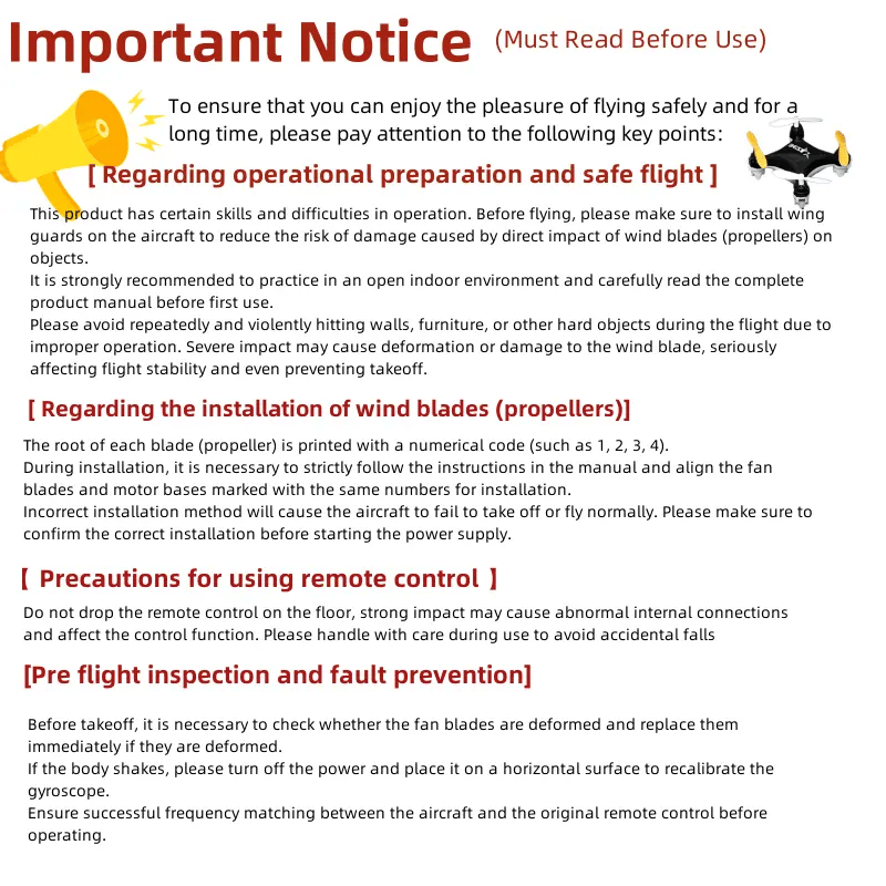 - Calibrate on a level surface before each flight and inspect propellers for deformation.