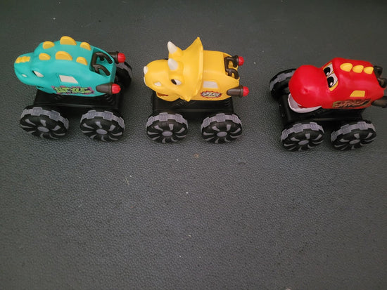 🦖 Dinosaur Tricolor Set (3-Pack) — featuring 3 dino-themed monster trucks: Red (Tyrannosaurus Rex), Green (Stegosaurus), and Yellow (Triceratops). Each dinosaur toy truck features a moving mouth and bright LED wheels—fun and engaging dinosaur car toys for toddlers and kids who love prehistoric adventures.